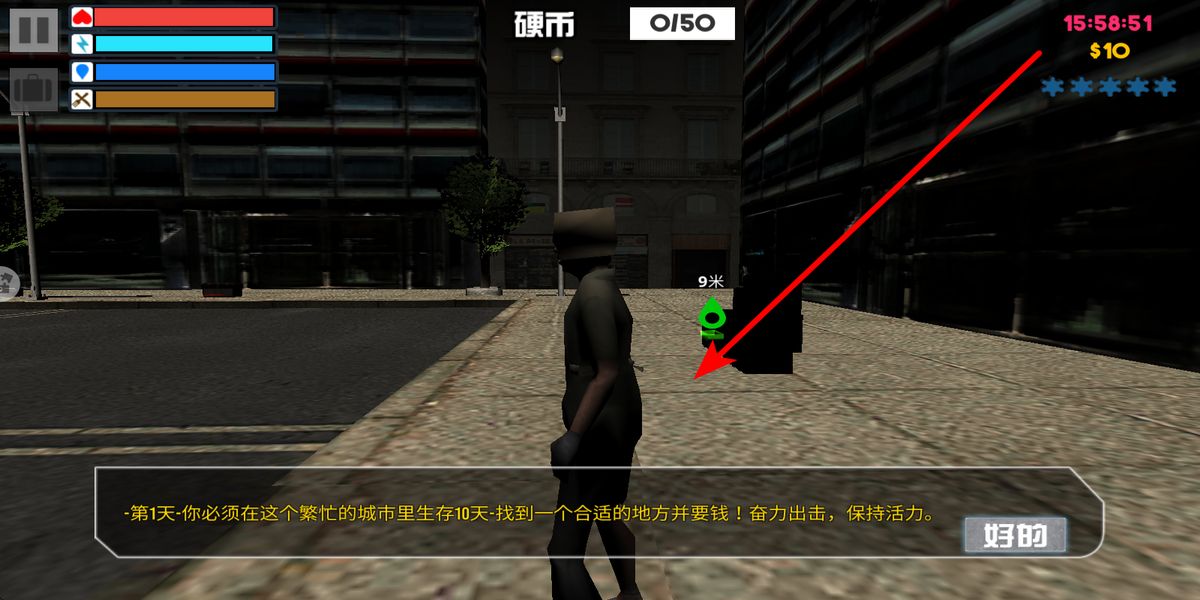 3、來城市場景后,界面彈出生存指引提示,依據(jù)提示去搜尋食物、硬幣等生存資源,按照箭頭指引移動(dòng)角色,完成第1天在繁忙城市艱難生存的基礎(chǔ)任務(wù),穩(wěn)步推進(jìn)進(jìn)程。