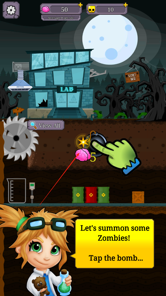 1、點擊培養(yǎng)皿,將系統(tǒng)贈送的低級亡靈拖入合成槽,根據提示點擊炸彈,消耗大腦等資源召喚僵尸,開啟召喚流程,推進亡靈合成。