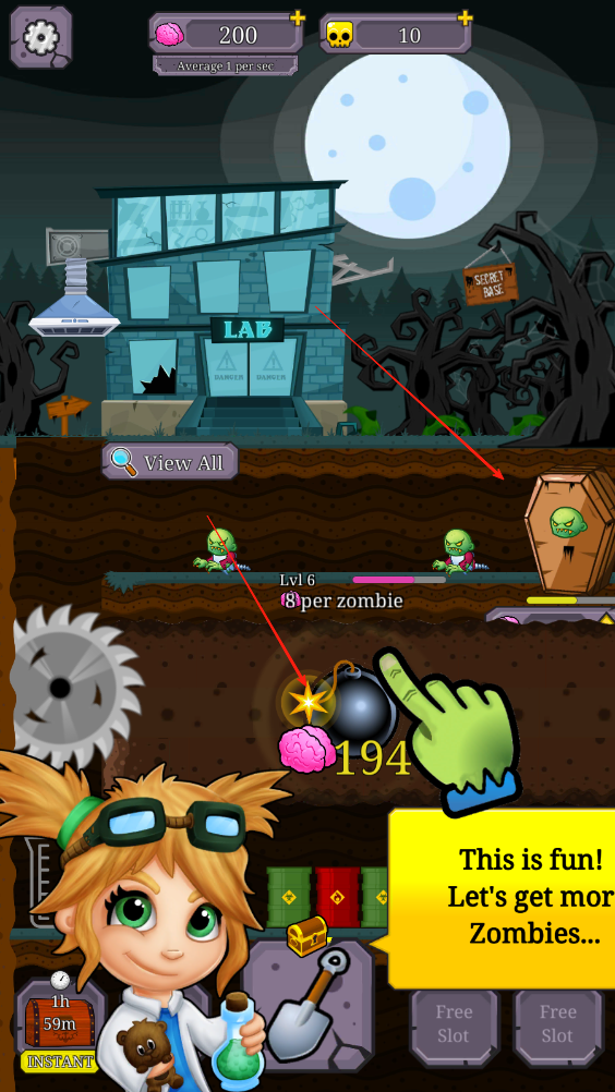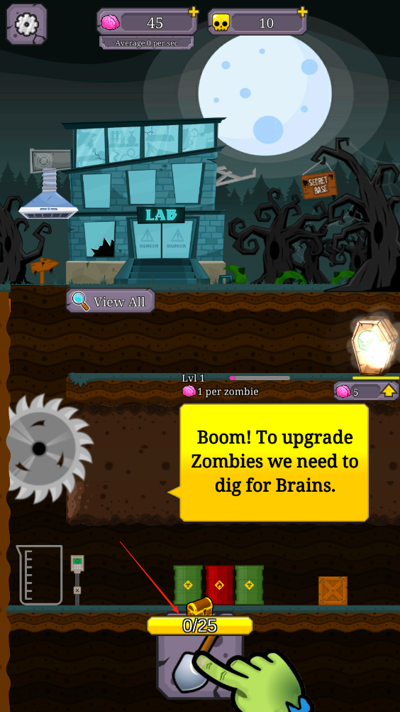 2、按照指引,使用鏟子挖掘大腦,積累升級僵尸所需的資源,滿足升級條件后可提升僵尸等級,增強其能力。