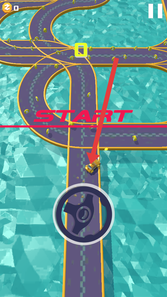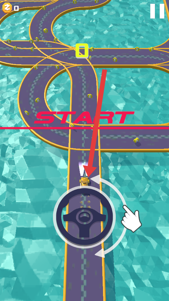 1、點(diǎn)擊START起跑,長按方向盤按鈕左右滑動控制賽車轉(zhuǎn)向,過彎道時提前打方向,避免落水。