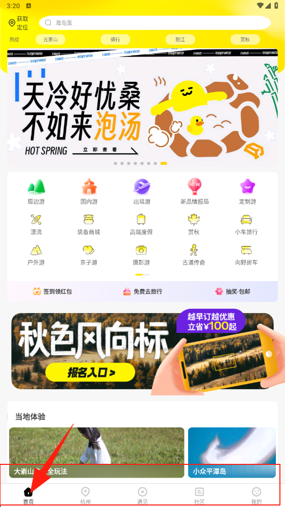 1、在首頁,瀏覽周邊游、國內(nèi)游等分類,點擊秋色風向標等活動,了解旅行項目,點擊選擇類型。