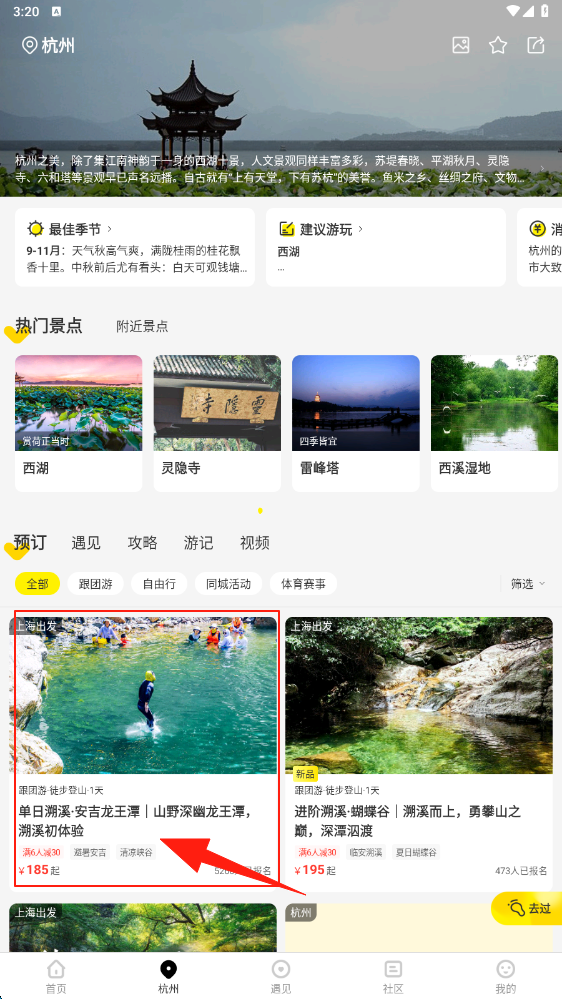 2、切換到杭州頁面,查看當?shù)責衢T景點,選擇單日溯溪等旅行產(chǎn)品,了解詳情并預(yù)訂。