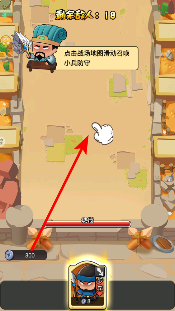 1、點擊開始游戲進入關(guān)卡,依據(jù)提示點擊戰(zhàn)場地圖滑動,消耗資源如初始300召喚小兵,像步兵等基礎(chǔ)兵種,快速在關(guān)鍵位置布置防線。
