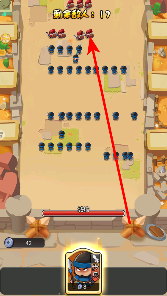 2、細致觀察剩余的敵人數(shù)量,敵人進攻時,根據(jù)其位置與行進路線,補充召喚小兵,阻擋敵人靠近城墻,優(yōu)先在敵人密集處增兵攔截。