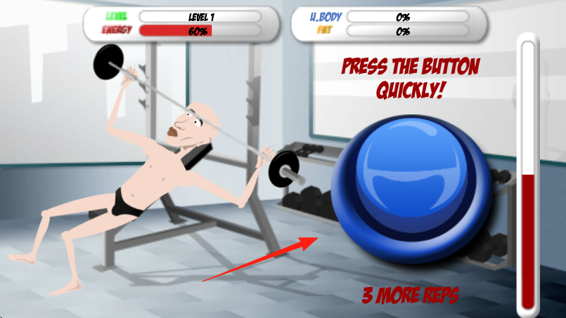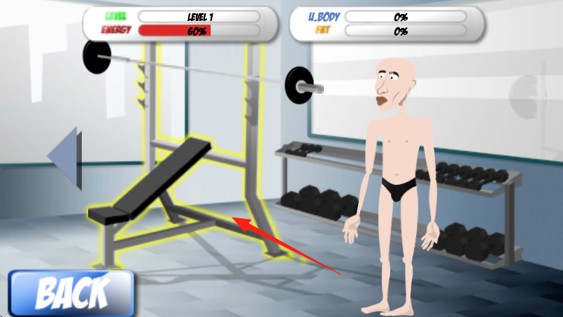 2、如下圖所示,角色躺著健身器材上,按照箭頭指示點擊藍(lán)色按鈕進(jìn)行鍛煉。