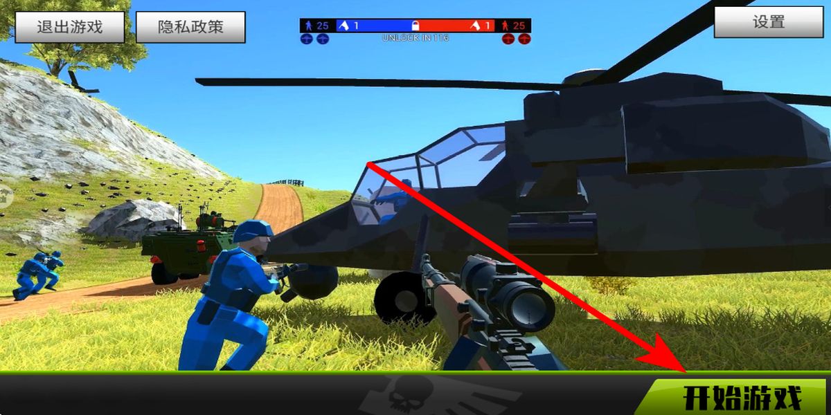 1、進入游戲后點擊開始游戲按鈕開啟征程,要留意界面上方雙方人數(shù)和比分,根據(jù)局勢調(diào)整策略,合理利用載具快速轉(zhuǎn)移位置。