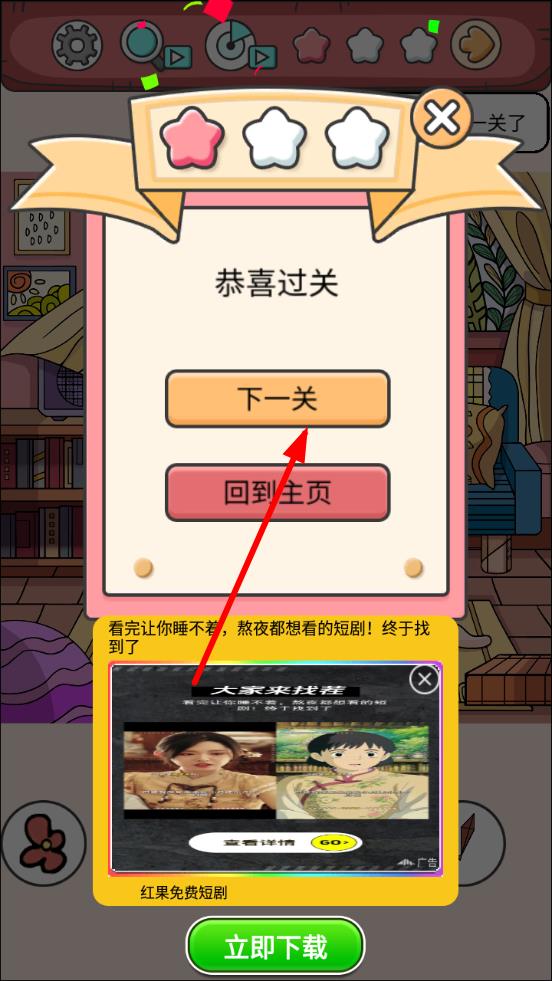 3、完成當(dāng)前關(guān)卡后,解鎖下一關(guān)及新的場景主題,持續(xù)挑戰(zhàn)更高難度的找茬任務(wù),收集解謎資源解鎖專屬成就。