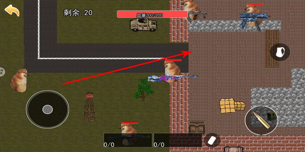 2、進入經(jīng)典模式場景,通過虛擬搖桿移動角色,探索區(qū)域?qū)ふ倚薰纺繕耍c擊射擊按鈕攻擊,依據(jù)剩余數(shù)量與場景布局,規(guī)劃路線,應(yīng)對不同位置的修狗。