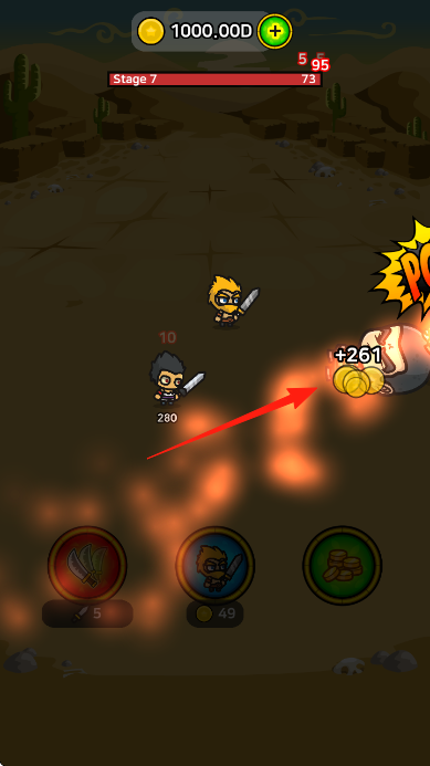 2、擊敗敵人后,會掉落金幣紅箭頭所指,收集這些金幣,用于后續(xù)升級或招募新的英雄。