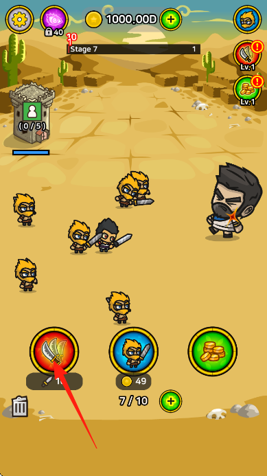 3、利用收集的金幣,點(diǎn)擊屏幕下方藍(lán)色的英雄圖標(biāo),招募新英雄,壯大隊(duì)伍,還能點(diǎn)擊紅色技能按鈕旁的升級標(biāo)識。