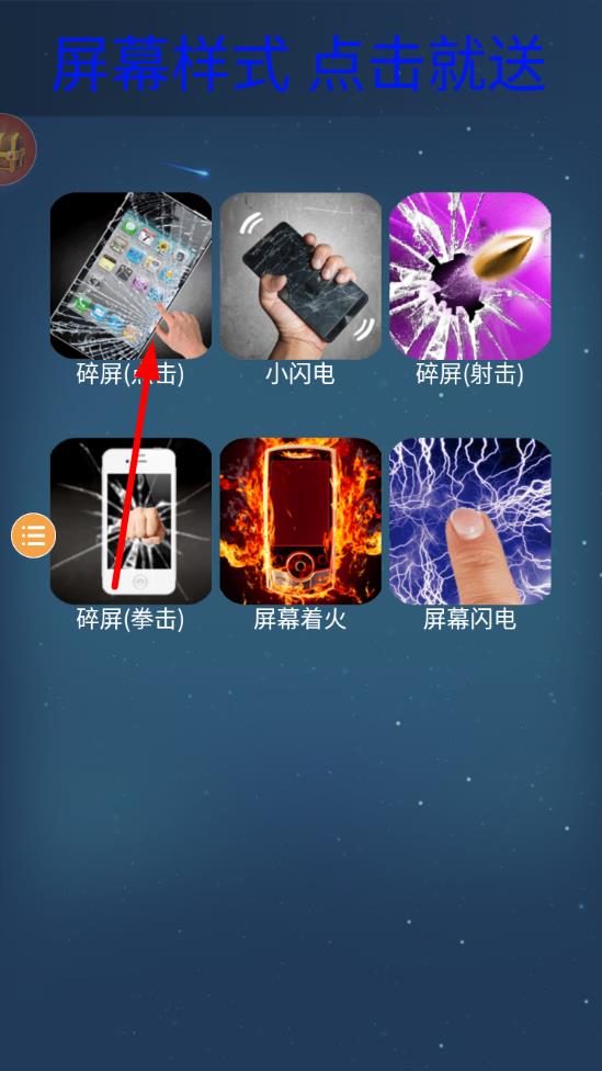 1、打開軟件后,進(jìn)入碎屏效果選擇界面,瀏覽不同的碎屏樣式如蛛網(wǎng)紋、放射紋、邊角碎裂等,選擇一種心儀的效果,熟悉觸發(fā)方式。
