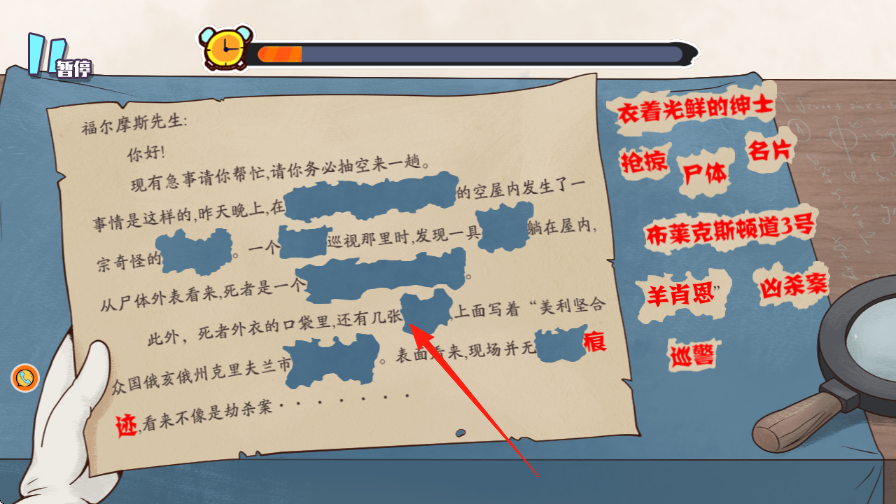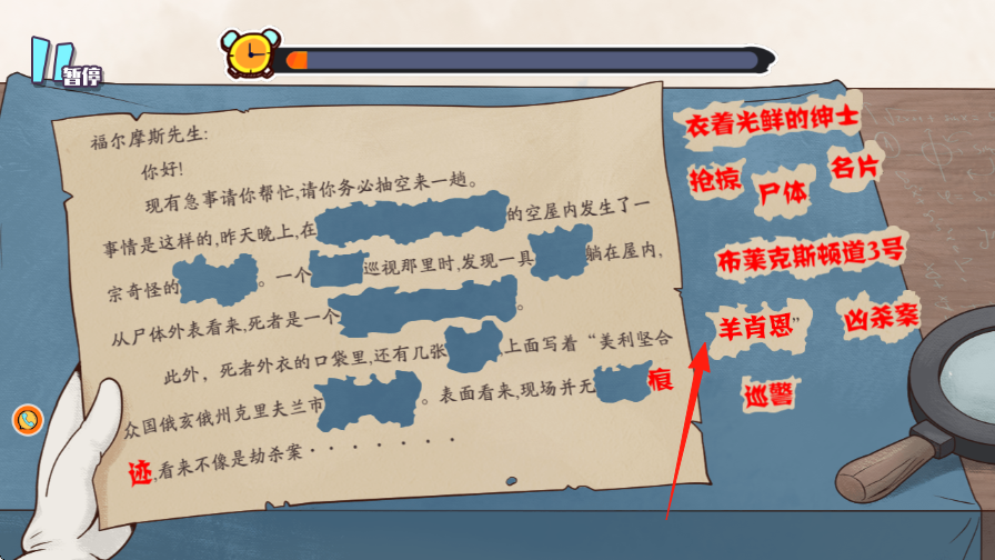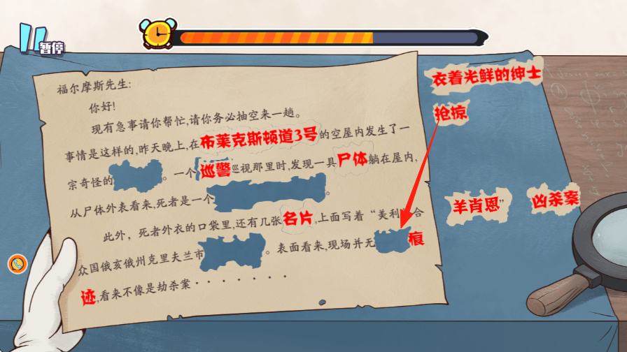1、觀察界面,右側(cè)有衣著光鮮的紳士,搶劫等詞匯,左側(cè)是帶污漬的信紙,需將右側(cè)詞匯拖入信紙對應(yīng)污漬處。