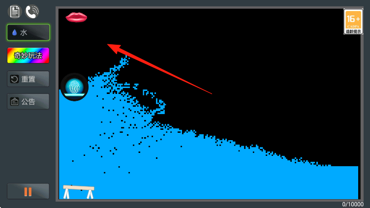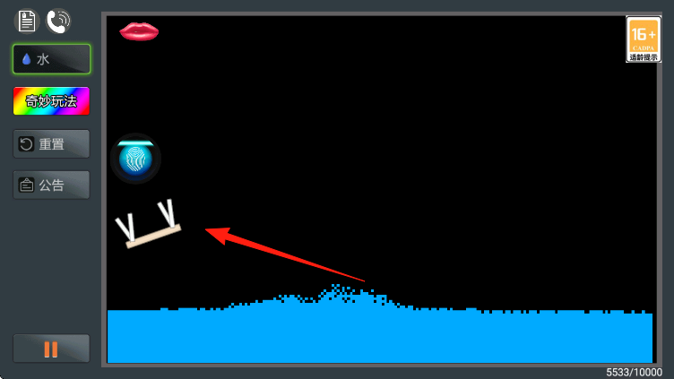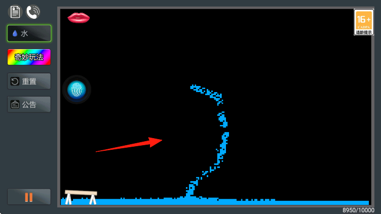 1、進入游戲界面,點擊左側【水】按鈕,在黑色背景區(qū)域釋放水流,觀察水流的運動軌跡。