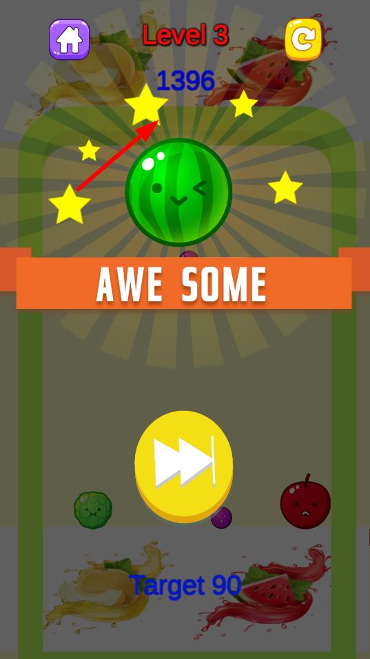 2、沉浸式視聽呈現(xiàn):采用卡通可愛的美術(shù)風(fēng)格,水果造型鮮活靈動(dòng),合并時(shí)伴有清新特效,搭配輕松明快的背景音樂,從視覺與聽覺雙重營(yíng)造愉悅氛圍,增強(qiáng)游玩代入感。
