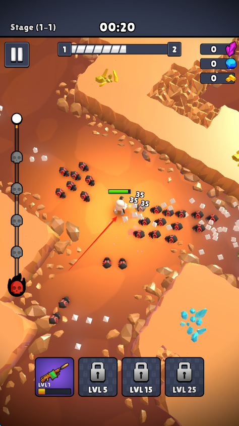 1、進入【Stage1-1】關(guān)卡,在限時內(nèi)操控角色,利用初始【LVL1】槍械射擊如紅箭頭所指的敵人,獲取分數(shù)。