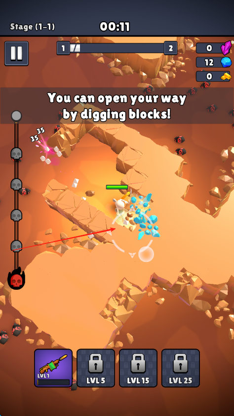 2、留意提示【You can open your way by digging blocks!】,射擊并破壞石塊開辟道路,收集途中藍色水晶資源。