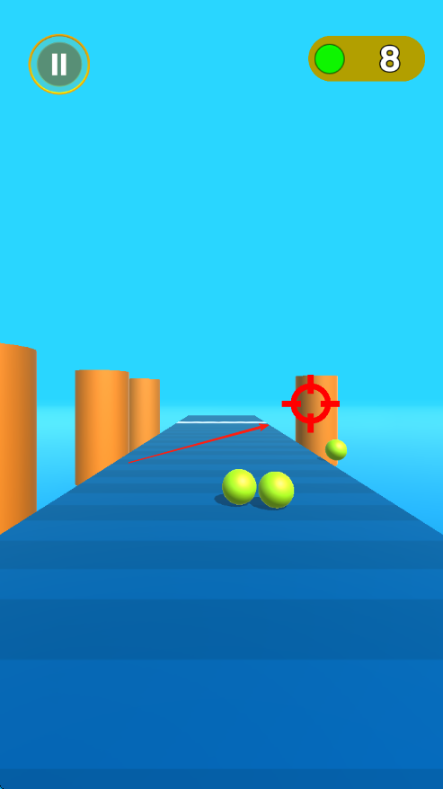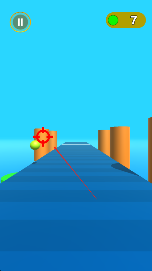 2、在游戲的過程當(dāng)中,如圖所示當(dāng)準(zhǔn)星對(duì)準(zhǔn)如紅箭頭所指的綠色球時(shí),點(diǎn)擊屏幕發(fā)射球,擊中目標(biāo)得分。