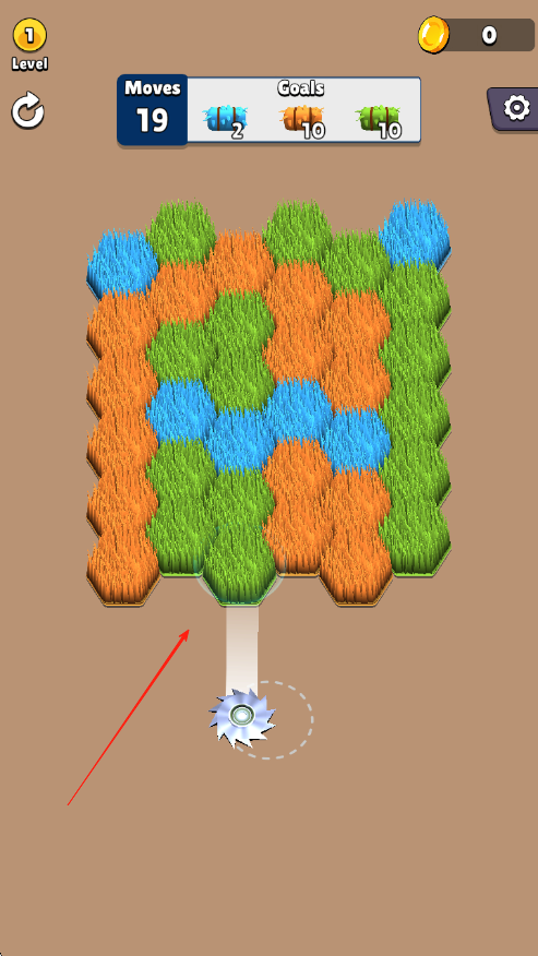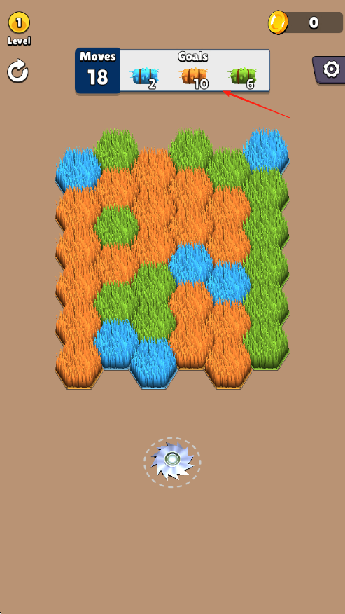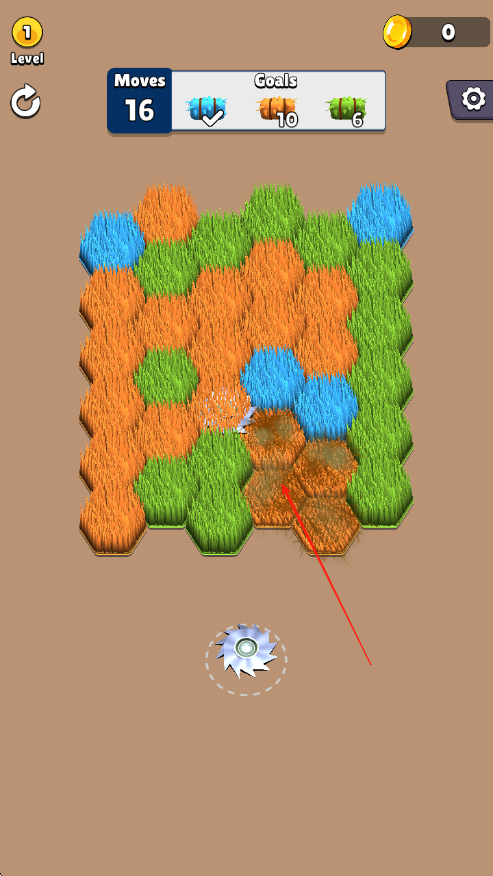 2、拖動(dòng)下方齒輪狀道具,按紅箭頭方向投擲,切割草堆,每切割一次消耗步數(shù),注意收集切割后的目標(biāo)草堆。
