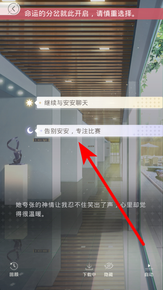 2、在劇情分支處,會(huì)出現(xiàn)繼續(xù)與安安聊天告別安安,專注比賽等選項(xiàng),需根據(jù)角色互動(dòng)傾向慎重選擇,不同抉擇導(dǎo)向不同故事走向。