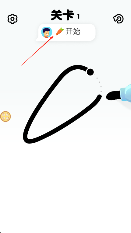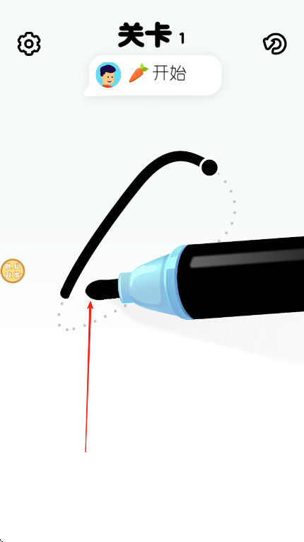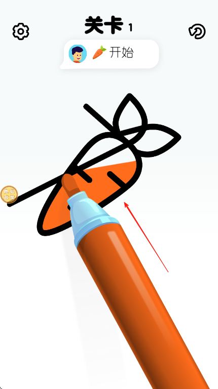 1、進(jìn)入關(guān)卡1,點(diǎn)擊屏幕,按紅箭頭方向用黑色畫筆勾勒?qǐng)D形輪廓,自由發(fā)揮或按構(gòu)思繪制。