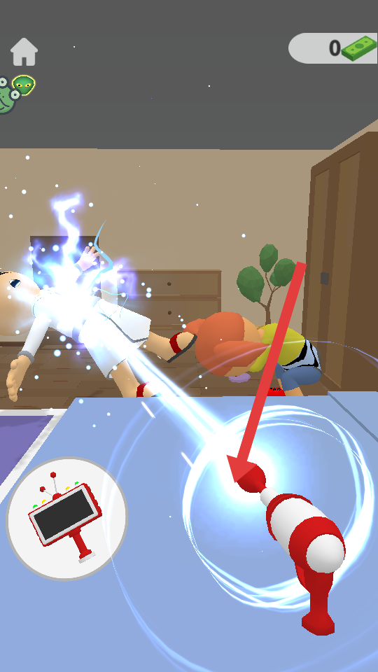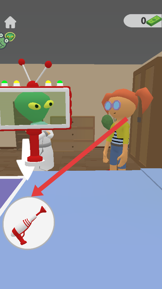 3、觀察角色操作后的場(chǎng)景反饋,嘗試將紅色射線槍與外星人電視裝置組合使用,完成趣味解謎挑戰(zhàn)。