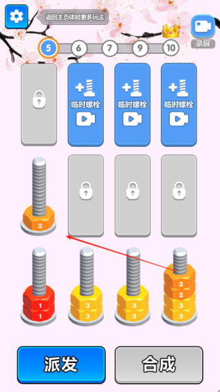 2、道具使用策略:合理利用游戲中的道具,如顏色替換道具,可將一種螺絲顏色變?yōu)樗桀伾陉P(guān)鍵時(shí)候打破僵局,消除道具則能瞬間消除場(chǎng)上同色螺絲。