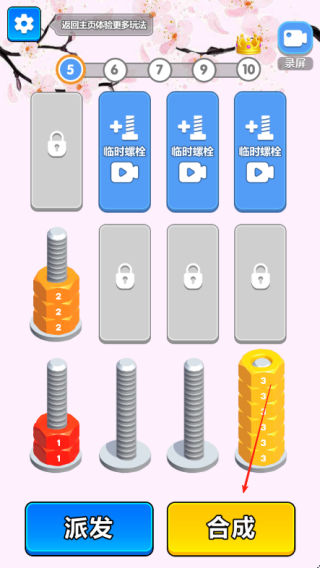 3、完成一定數(shù)量螺栓合并后,點(diǎn)擊下方【合成】按鈕,進(jìn)行批量合成,提升整體等級(jí),推進(jìn)游戲進(jìn)程。