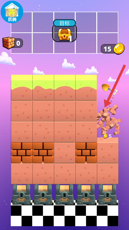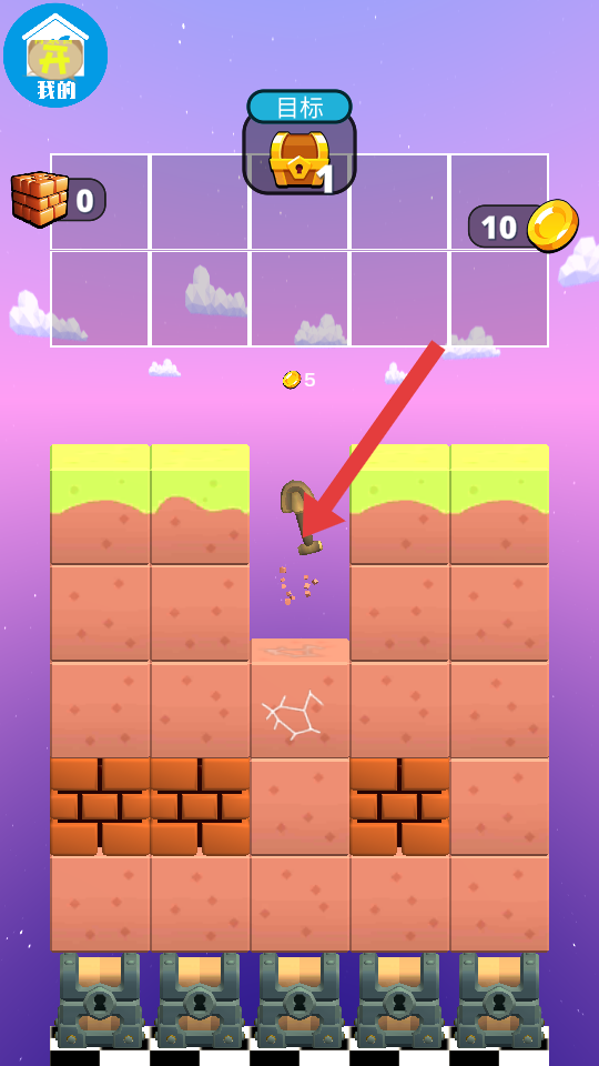 1、進(jìn)入關(guān)卡后,點(diǎn)擊屏幕操控鏟子下落,選擇有金幣標(biāo)識(shí)的挖掘,沿著金幣分布路徑挖通,收集資源。