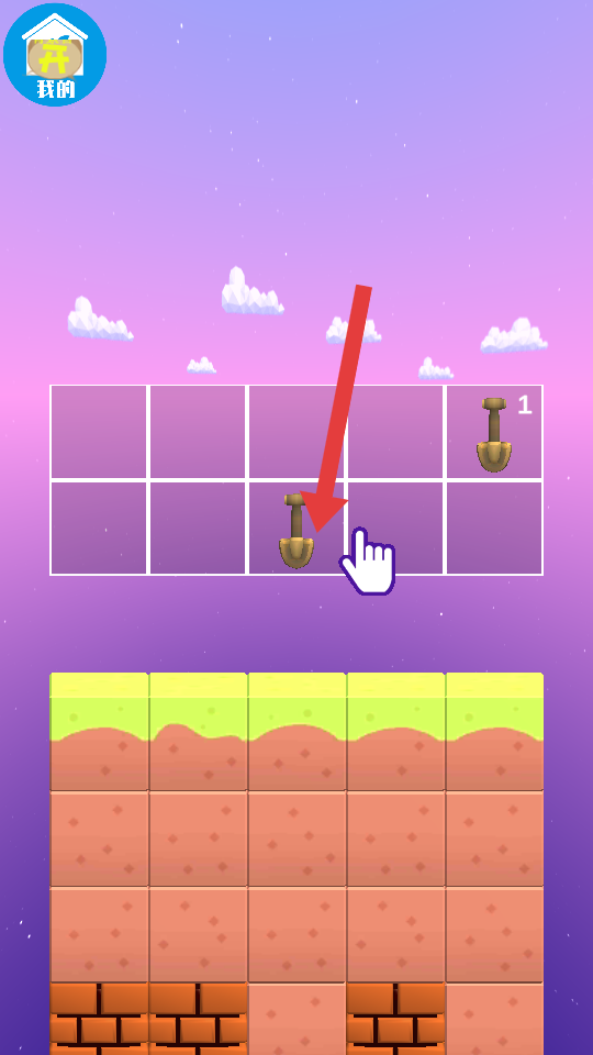 2、當(dāng)挖掘至上方空白格子區(qū)域時(shí),將獲得的新鏟子工具放置其中,以此拓展挖掘路線(xiàn),遇到磚塊層阻礙。