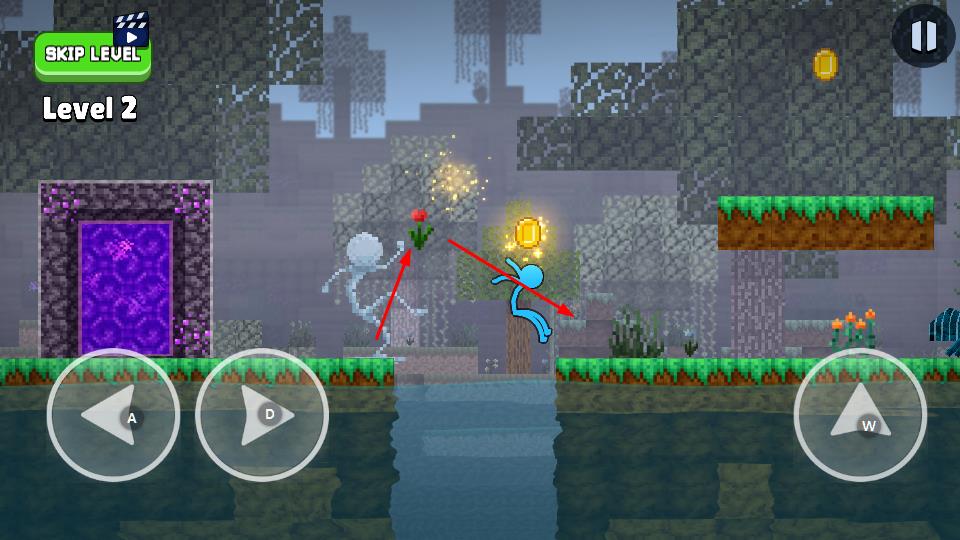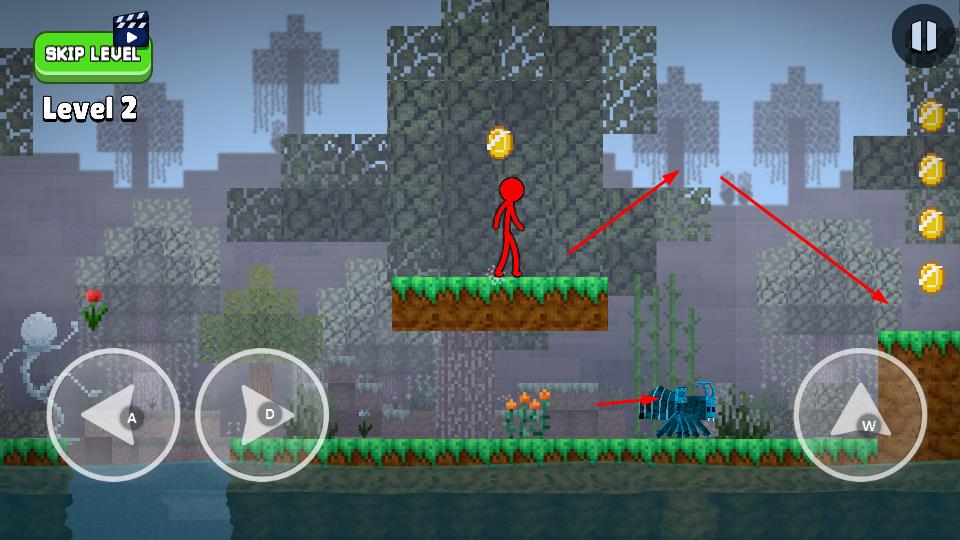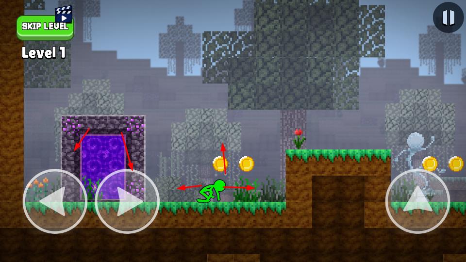 1、進入Level1,通過左下角方向鍵控制火柴人移動,收集場景內(nèi)金幣,靠近紫色傳送門。