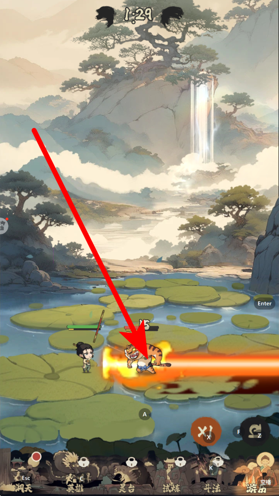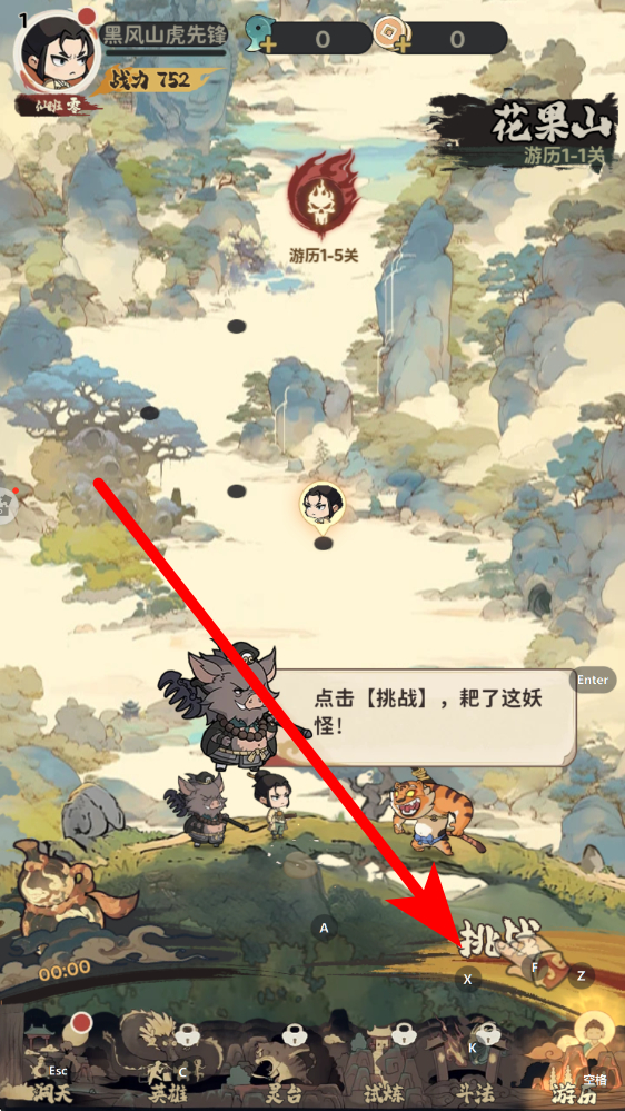 2、準(zhǔn)備挑戰(zhàn)妖怪觸發(fā)在花果山游歷場(chǎng)景畫面,跟隨指引點(diǎn)擊挑戰(zhàn)按鈕,觸發(fā)與虎妖等妖怪的對(duì)決,推動(dòng)游歷關(guān)卡如1到1關(guān)進(jìn)度。