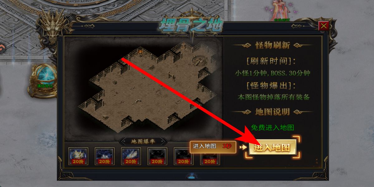 1、進(jìn)入地圖找到埋骨之地入口界面,確認(rèn)地圖免費(fèi)進(jìn)入后,等待倒計(jì)時(shí)結(jié)束,點(diǎn)擊進(jìn)入地圖按鈕,踏入場(chǎng)景準(zhǔn)備挑戰(zhàn)怪物獲取裝備。