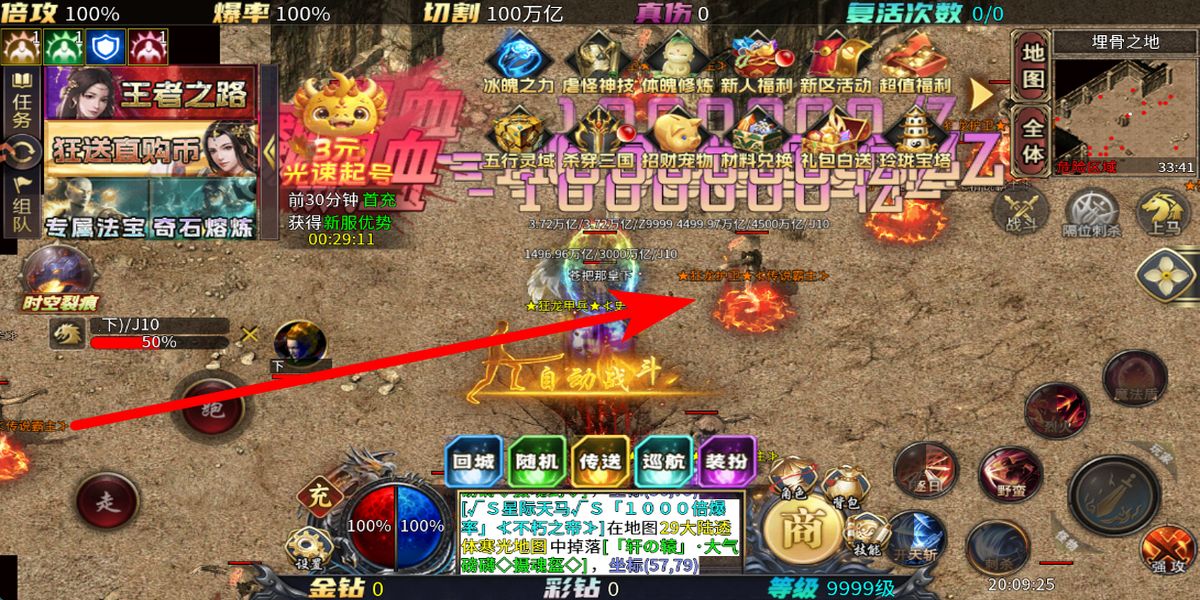 2、開(kāi)啟自動(dòng)戰(zhàn)斗功能,角色自動(dòng)追擊怪物,憑借100%爆率與100萬(wàn)億切割屬性快速清怪,留意BOSS每30分鐘刷新,優(yōu)先爭(zhēng)奪高收益目標(biāo)。
