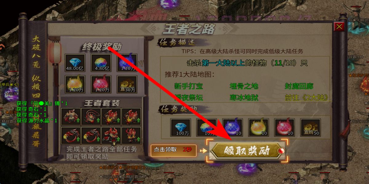3、任務(wù)領(lǐng)獎(jiǎng)刷怪時(shí)推進(jìn)王者之路任務(wù),當(dāng)擊殺第一大陸以上怪物數(shù)量達(dá)標(biāo),打開(kāi)任務(wù)界面,點(diǎn)擊領(lǐng)取獎(jiǎng)勵(lì)獲取鉆石奇石等道具助力成長(zhǎng)。