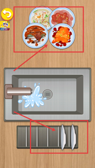 2、將臟盤子移至水槽沖洗,洗凈后放置下方【瀝干區(qū)】,完成餐具整理的步驟流程。
