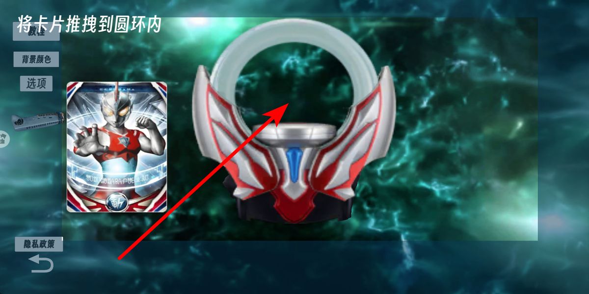 1、進(jìn)入歐布的圓環(huán)界面,選中左側(cè)奧特融合卡牌,長按卡片向圓環(huán)區(qū)域拖動(dòng),將卡牌推送至圓環(huán)內(nèi),完成變身前的卡牌加載步驟。