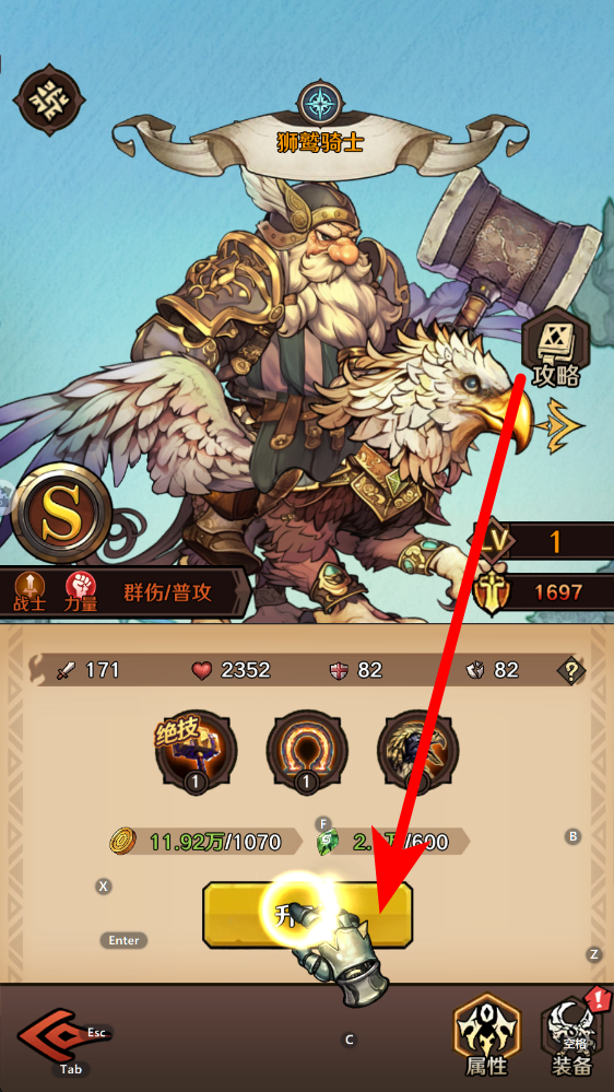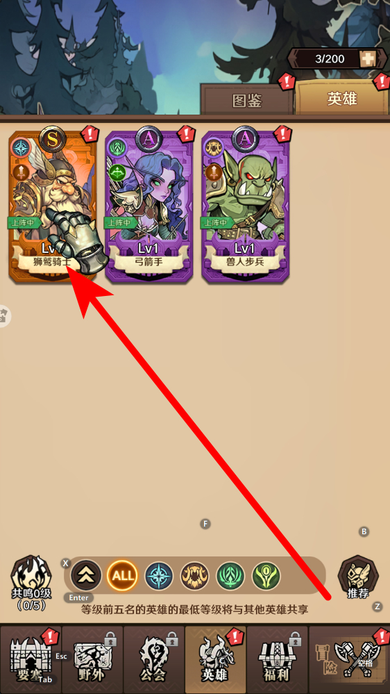 1、選核心英雄進(jìn)入英雄界面,優(yōu)先選定S級英雄獅鷲騎士,其成長與技能優(yōu)勢更突出,點(diǎn)擊卡牌查看職業(yè)定位群傷普攻等,明確主力培養(yǎng)對象,為戰(zhàn)力奠基。