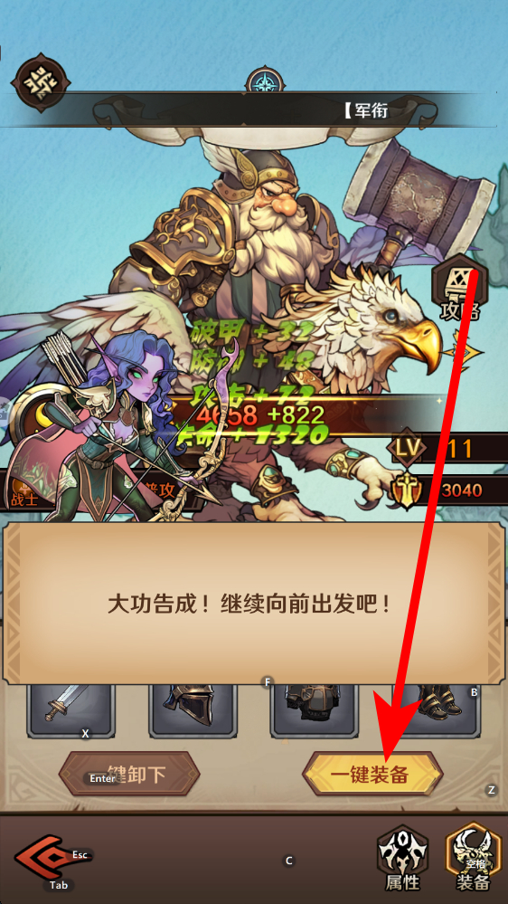 3、一鍵配裝備戰(zhàn)斗或副本獲取裝備后,在裝備界面點(diǎn)擊一鍵裝備,系統(tǒng)自動(dòng)為英雄穿戴最優(yōu)裝備,提升破甲、防御等屬性,快速完善戰(zhàn)力,適配戰(zhàn)斗需求。