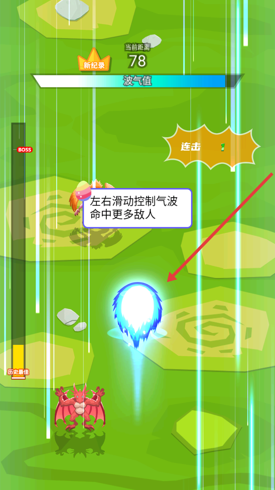 2、戰(zhàn)斗過程中,左右滑動屏幕控制氣波方向,盡量命中更多敵人,以此積累連擊數(shù)與波氣值。