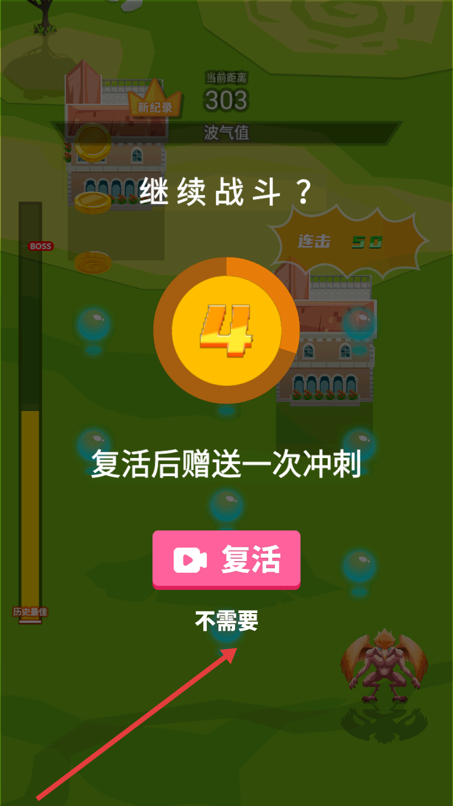 3、若挑戰(zhàn)失敗,可選擇復(fù)活觀看廣告繼續(xù)戰(zhàn)斗,也能點擊不需要直接重新開局,沖擊更遠距離。