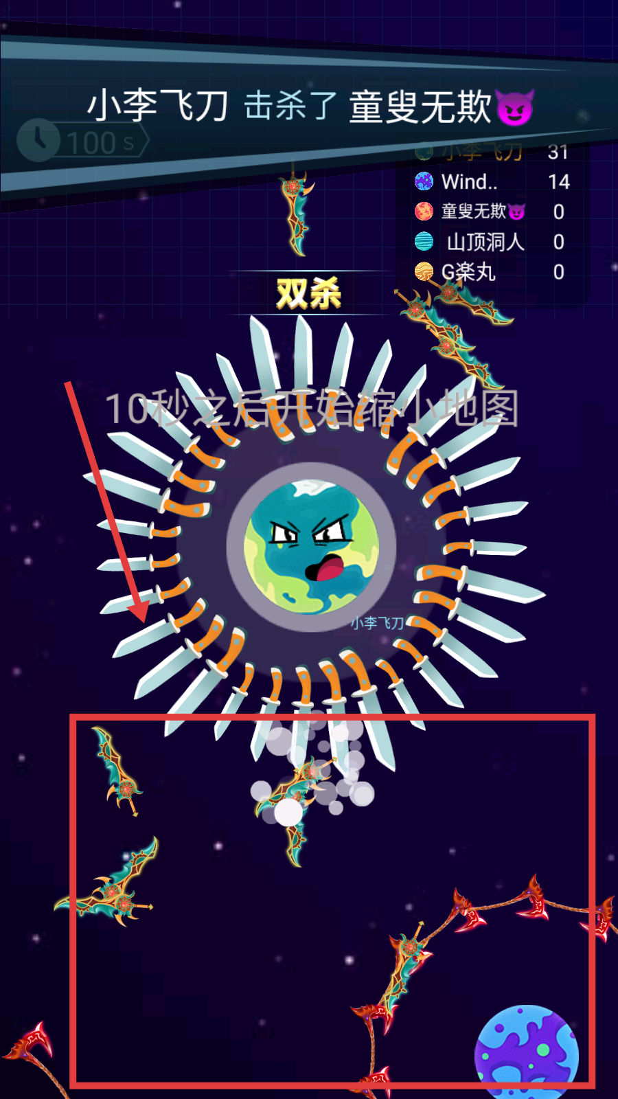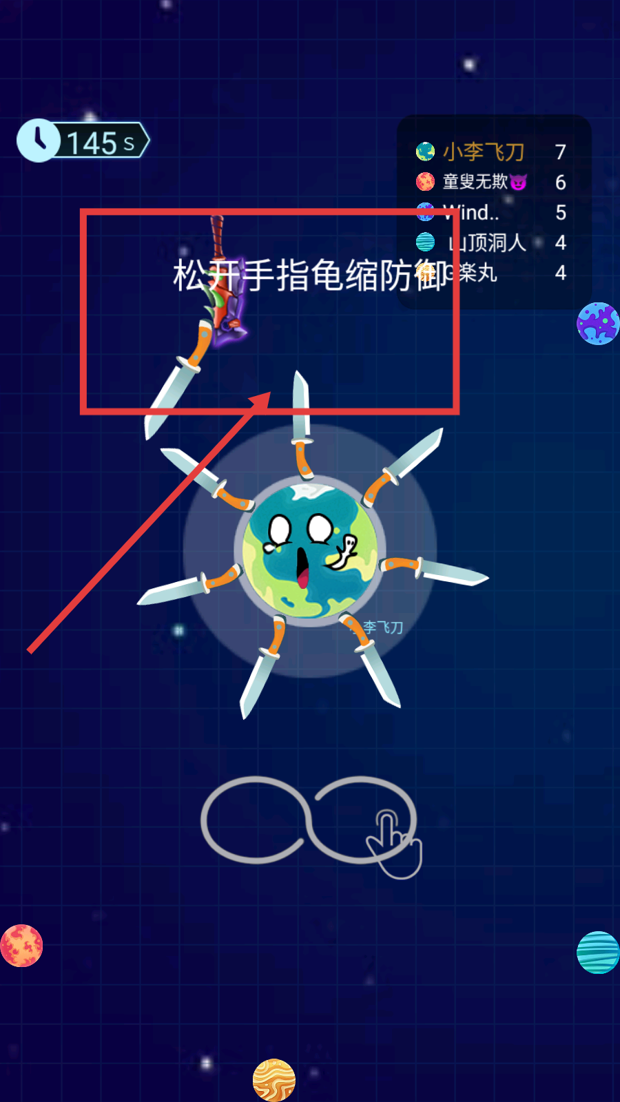 1、游戲中遇危險,可按提示【松開手指】觸發(fā)龜縮防御,依托飛刀陣抵擋敵方攻擊保生存。