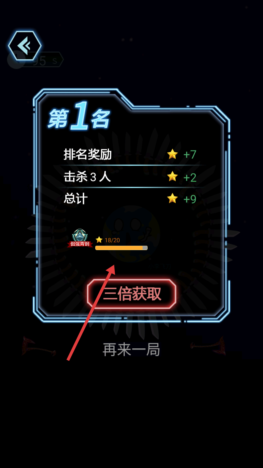 3、對局拿下【第1名】且擊殺3人時,點擊【三倍獲取】,加速積累星星推進(jìn)【倔強青銅】段位進(jìn)度。