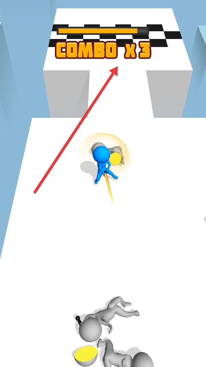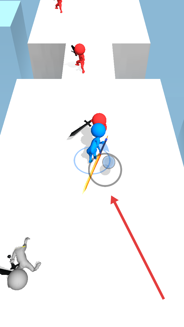 1、點(diǎn)擊屏幕操控藍(lán)色小人持劍前行,遇紅、灰敵人時(shí),點(diǎn)擊觸發(fā)攻擊,利用武器優(yōu)勢擊敗對手。