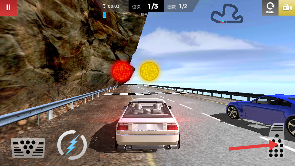 2、駕駛途中通過虛擬方向盤控制方向,點擊剎車鍵減速過彎,收集賽道上的加速道具,利用道具在關(guān)鍵路段實現(xiàn)快速沖刺。
