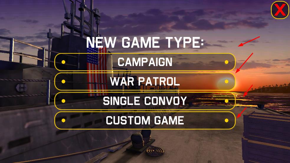 1、主界面選擇模式戰(zhàn)役CAMPAIGN、戰(zhàn)爭巡邏WAR PATROL、單護(hù)航隊(duì)SINGLE CONVOY、自定義CUSTOM GAME。