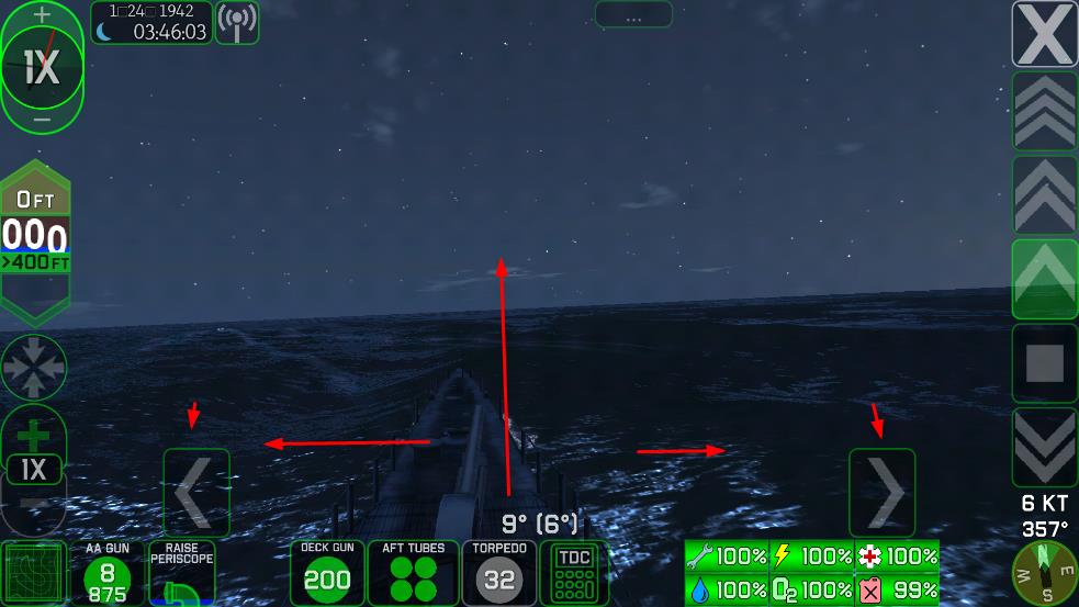 2、通過左右箭頭調(diào)整航向,底部面板管理武器甲板炮、魚雷管,監(jiān)控系統(tǒng)狀態(tài)電量、氧氣、損傷。