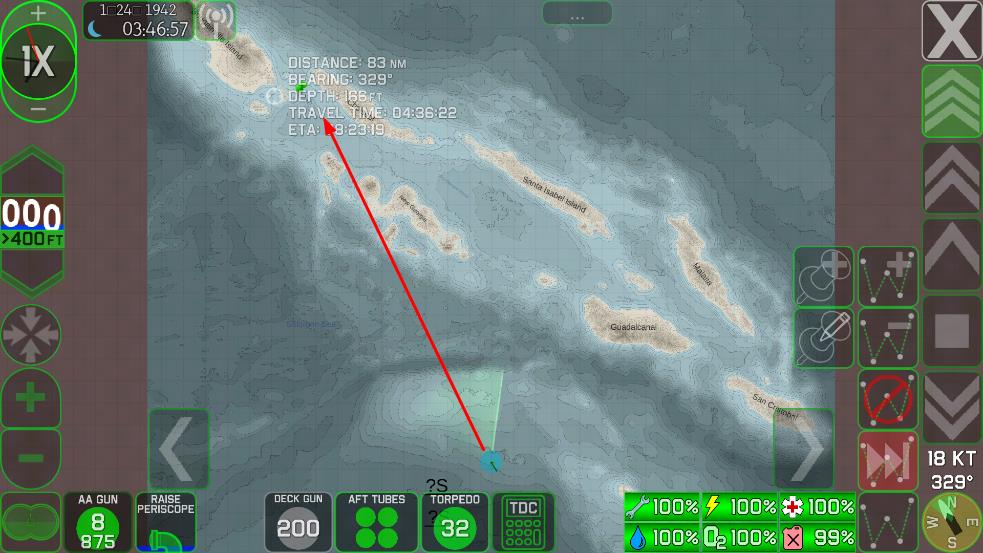3、查看地圖界面的距離、方位、深度數(shù)據(jù),規(guī)劃航線,執(zhí)行巡邏、攻擊敵方船隊(duì)等任務(wù),完成目標(biāo)推進(jìn)流程。