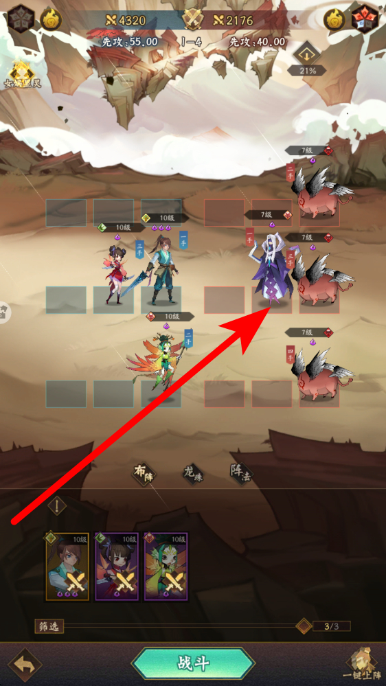 3、戰(zhàn)斗布陣進(jìn)入戰(zhàn)斗前,新手可以在布陣界面調(diào)整神仙站位,根據(jù)敵方陣容,合理安排角色位置,利用先攻等機(jī)制,點(diǎn)擊戰(zhàn)斗開啟對決,贏取勝利。
