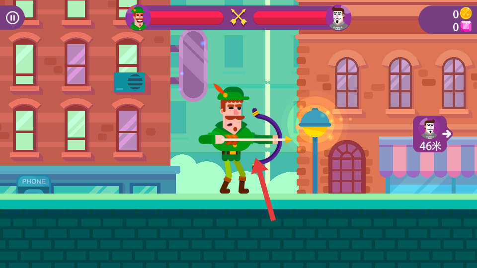 2、在關(guān)卡推進過程中,用手指拖動屏幕來調(diào)整射箭的角度與發(fā)射力度,緊盯敵人移動軌跡,優(yōu)先瞄準(zhǔn)敵人頭部發(fā)射箭矢,擊敗敵人后收集掉落的積分與輔助道具。
