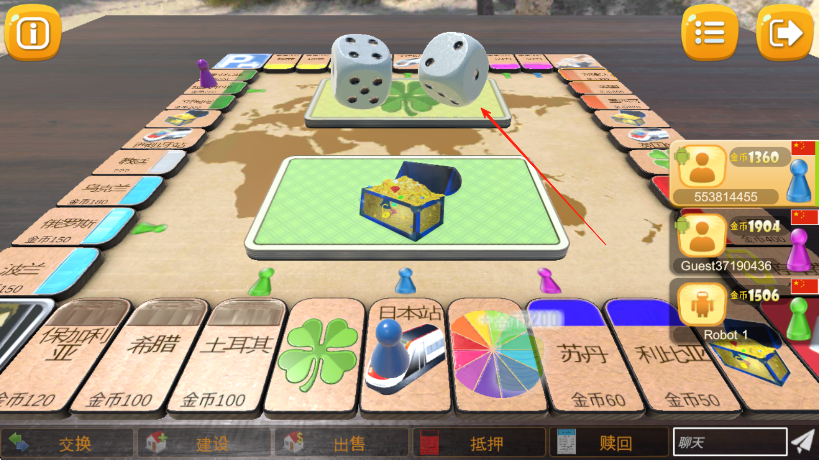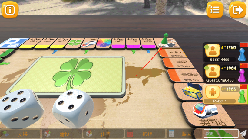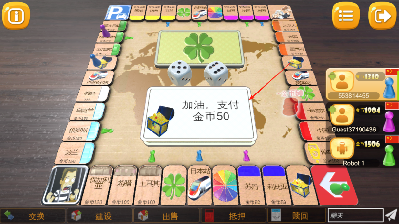 3、若走到其他玩家占領(lǐng)的格子,按提示支付金幣,利用交換,建設(shè)等下方功能按鈕,進行資產(chǎn)操作和策略布局,率先積累大量財富或達成特定條件獲勝。
